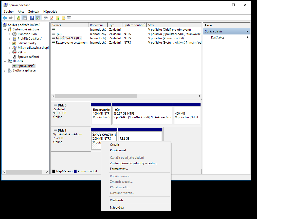 Zdravím, mám 8GB USB disk ale ukazuje mi v PC zlomek velikosti ve správě disků to nejde spojit formátoval jsem stále nic na druhou polovinu s větší kapacitou nelze připojit písmeno ani formátovat máte nějakou radu?