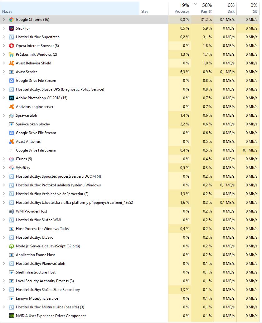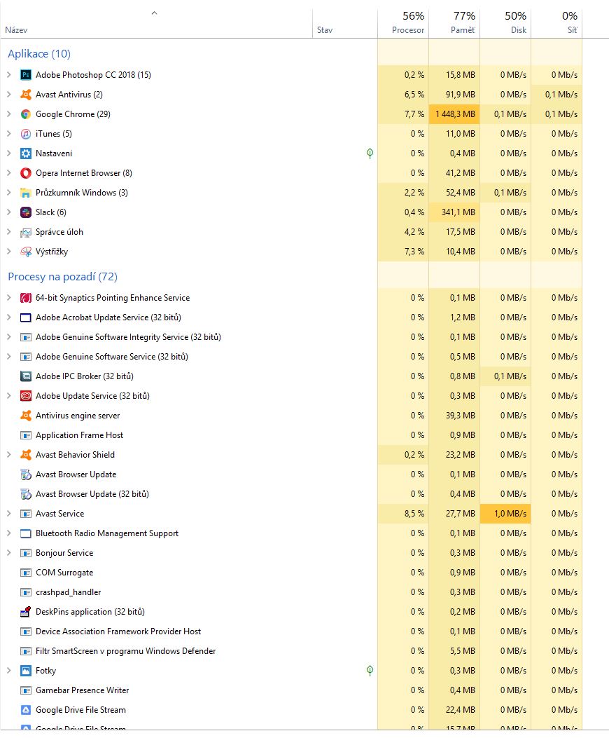 Nejvíce paměti obvykle využívá Chrome a Photoshop. Jak je ale vidět na screenu, pamět je využitá celkově ze 77%, spuštěné procesy by ale na těch 77% ani zdaleka neměly "dosáhnout". Mezi Procesy na pozadí také neběží nic, co by využívalo abnormálně hodně paměti (celkově můžou v součtu procesy na pozadi, alespoň z toho, co vidím ve Správci úloh, využívat maximálně 1 GB paměti).