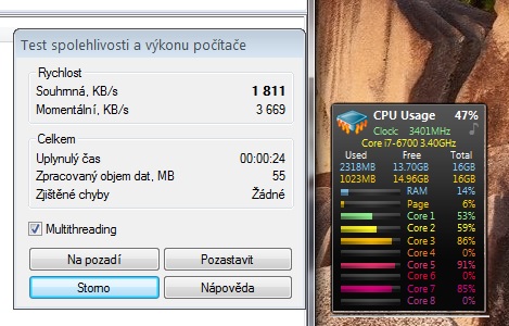 Viz. obrázky v příloze. Použita minaplikace CPU Meter na ploše a test ve WinRAR.