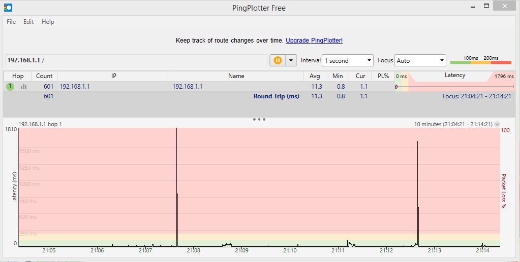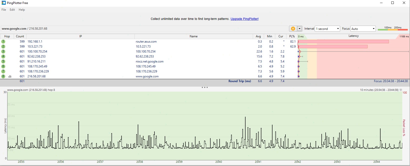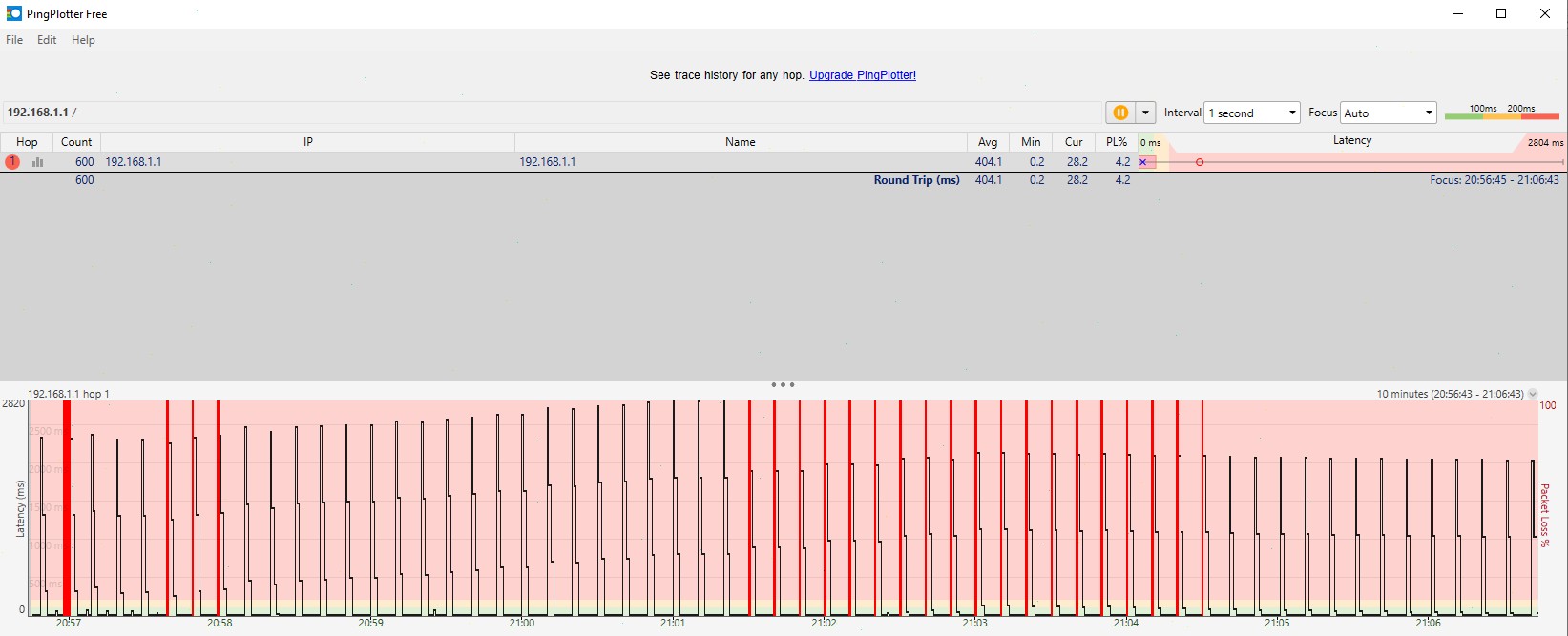 mám problémy s nestabilním připojením stolního počítače k routeru. Připojení přes wifi 5GHz je téměř nepoužitelné, dochází velice často k odpojování a zase připojování k této síti. Nelze stahovat větší soubory, jelikož při odpojení ze sítě se stahování přeruší. Nelze hrát ani CS:GO, jelikož pokaždé do 5-ti minut hraní mě to odpojí ze hry z důsledku výpadku připojení. při prohlížení internetu se občas nenačtou stránky. Stav signálu je 3/4, počítač je umístěn 2m od routeru, mezi počítačem a routerem je pouze dřevotřísková stěna poličky. na 5 GHz síť mám připojený pouze tento počítač. Screen z PingPlotteru: