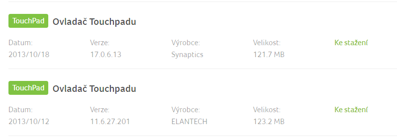 Mometálně (řešený ntb, záložní disk win7) správce zařízení neukazuje přitomnost žádného ovladače pro touchpad (interní klávesnice ani touchpad nemohou fungovat i se správnýma driverama po zásahu servisu, provozován s externíma komponentama) a neukazuje ani že by chyběl.