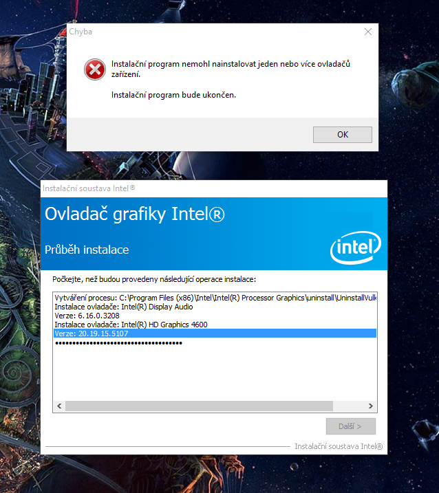 potýkám se s problémem týkající se instalací ovladačů Intel(R) HD Graphics 4600. Na stránce https://www.intel.com/content/www/us/en ... stant.html jsem si zjistil, které ovladače přesně potřebuji. Dal jsem instalovat ovladače a vyskočila chyba "Instalační program nemohl nainstalovat jeden nebo více ovladačů zařízení. Instalační program bude ukončen" (viz. příloha). Počítač je nově po instalaci Windows 10. Děkuji za veškeré rady.