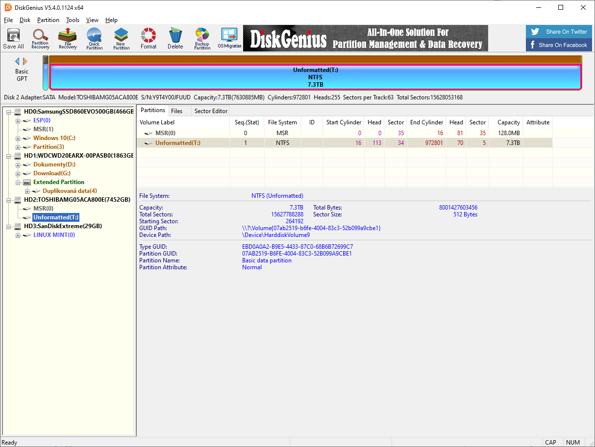 V diskgeniusu se mi tentokrát zobrazuje jako "unformatted" , minule jsem tam data alespoň viděl