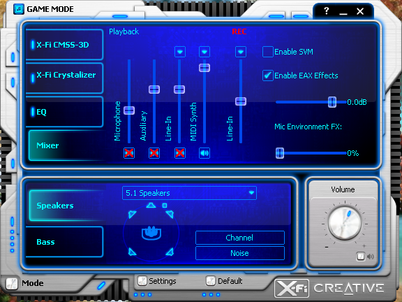 A jak máš kartu nastavenou softwarově?Musíš mít nějaký kontrol panel na kterém se nechá nastavit.Creative audio karty ořezávala na ovladačích oproti herním ale nějaký tam máš tak ho zkus nastavit.Já mám třeba tohle.