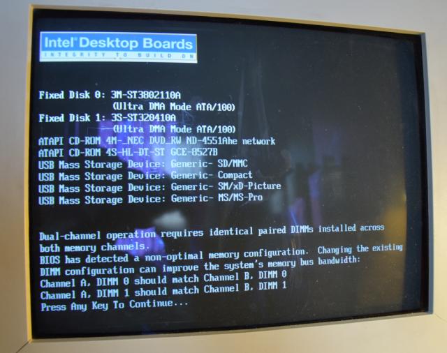 koupil jsem si jednu novou RAMku na doplnění stávajících 2 (vše A-Data 1024MB), po spuštění PC se správně zobrazí 3072MB RAM, ale potom vyskočí hláška (viz. níže). Po zmáčknutí klávesy ovšem PC funguje. Deska je Intel La Crosse D865GLC.