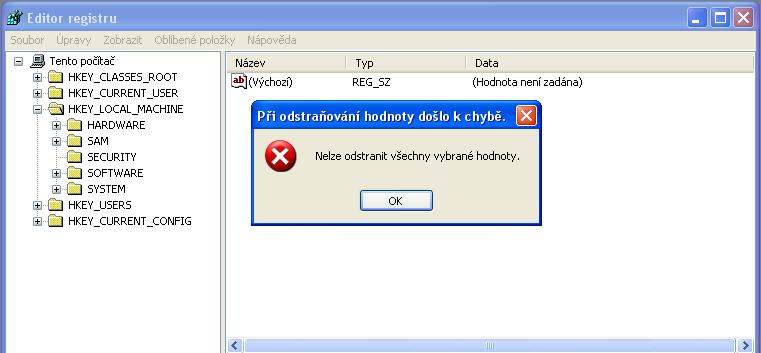 V RegEditu to nejde smazat,"Nelze odstranit všechny vybrané hodnoty".