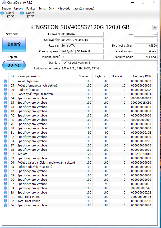 Nainštaluj si ten Kingston SSD Manager a pozri sa , či Ti neponúkne novší firmware pre disk.Máš ten disk zapojený na doske v Sata1 ?Aj nový Sata kábel nemusí byť v poriadku.