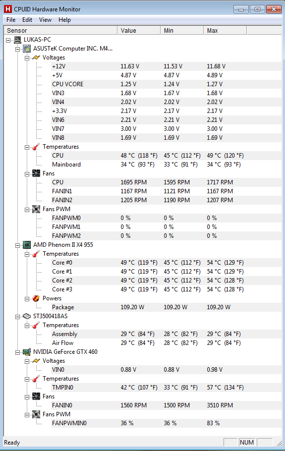 S teplotami, si myslím, že problém nemám a tak zhruba jednou až dvakrát do měsíce počítač "odprachuju". Ve Smartdoctoru mám nastavený program větráku SmartCooling, takže si fouká kolik potřebuje. Jinak HWmonitor zahrnuje i spuštění Bioshock Infinte benchmarku na ultra nastavení, aby byly vidět data v zátěži. Jinak když nic neběží, tak teplota je zhruba okolo 35°C. Když se doma netopí, tak 30°C :D.