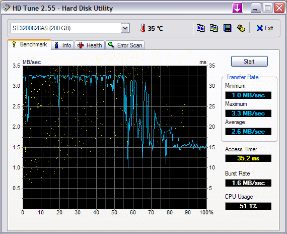 Jak ukazuje HD Tune, rychlost klesla na samé dno. S tím je spojených i plno problému ve Windows - sekání, nenaběhnutí aplikací, padání procesů. Zajímalo by mě jestli existuje nějaké řešení nebo stařečka nechat důstojně odejít do křemíkového nebe, přece jen má naběhnuto už přes 65tisíc hodin.
