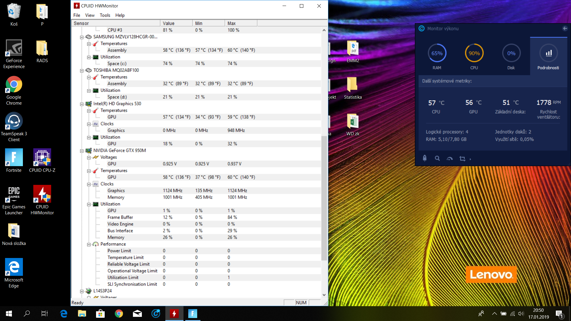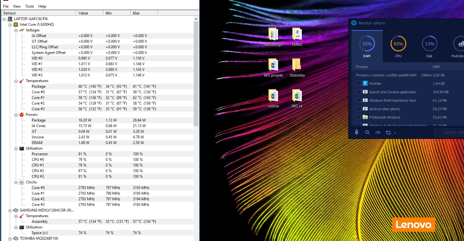 Při hraní her (Fortnite, CSGO) se stává nepravidelně ( jeden den funguje, druhý zas ne), že se mi po pár minutách hraní hry vypne celý PC. Když ho opět nahodím, problém přetrvá a opět se stane to samé - hraju cca 5 min a najednou černá obrazovka - notebook vypnutý. Kamarád mi poradil vyčistit notebook zevnitř (je cca 2,5 roku starý). Rozebrali jsme ho, vyčistili, dali tam něco, čemu říkal termopasta (vyčistil od staré, aplikoval novou). 3 dny PC fungoval a pak znovu ten stejný problém. Říkal jsem si, že by to mohlo být windowsem (11.12 byla aktualizace a 12.12 začal chybovat). Přeinstalovali jsme windows a stále to samé. Když při hraní Fortnite kontroluji teploty (pokud se zrovna počítač rozhodne spolupracovat a hry běží, tak jak mají), tak vidím hodnoty cca CPU-70 GPU-70 ZD-60-65 stupňů. Využití RAM cca 60-70 procent CPU podobně. Fortnite hraju na nižší detaily FPS cca 100. Ještě bych rád podotkl, že pokud se PC jednou vypne tak po opětovném zapnutí problém setrvá. Ale když zkusím hru další den, tak je to tak 50/50 jestli bude fungovat. Prostě to dělá nepravidelně,ale jakmile jednou padne, tak pp zapnutí se nic nemění. Fortnite i CSGO hraju z HDD