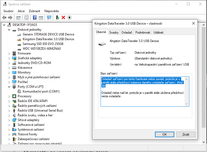 Když připojím do jakéhokoli usb portu usb disk a zapnu pc tak se načte, pokud ho ovšem odpojim a znovu připojim tak se ve správci zařízení objeví chyba: Ovladač zařízení pro tento hardware nelze zavést, protože je v paměti stále předchozí instance daného ovladače zařízení. (Kód 38).