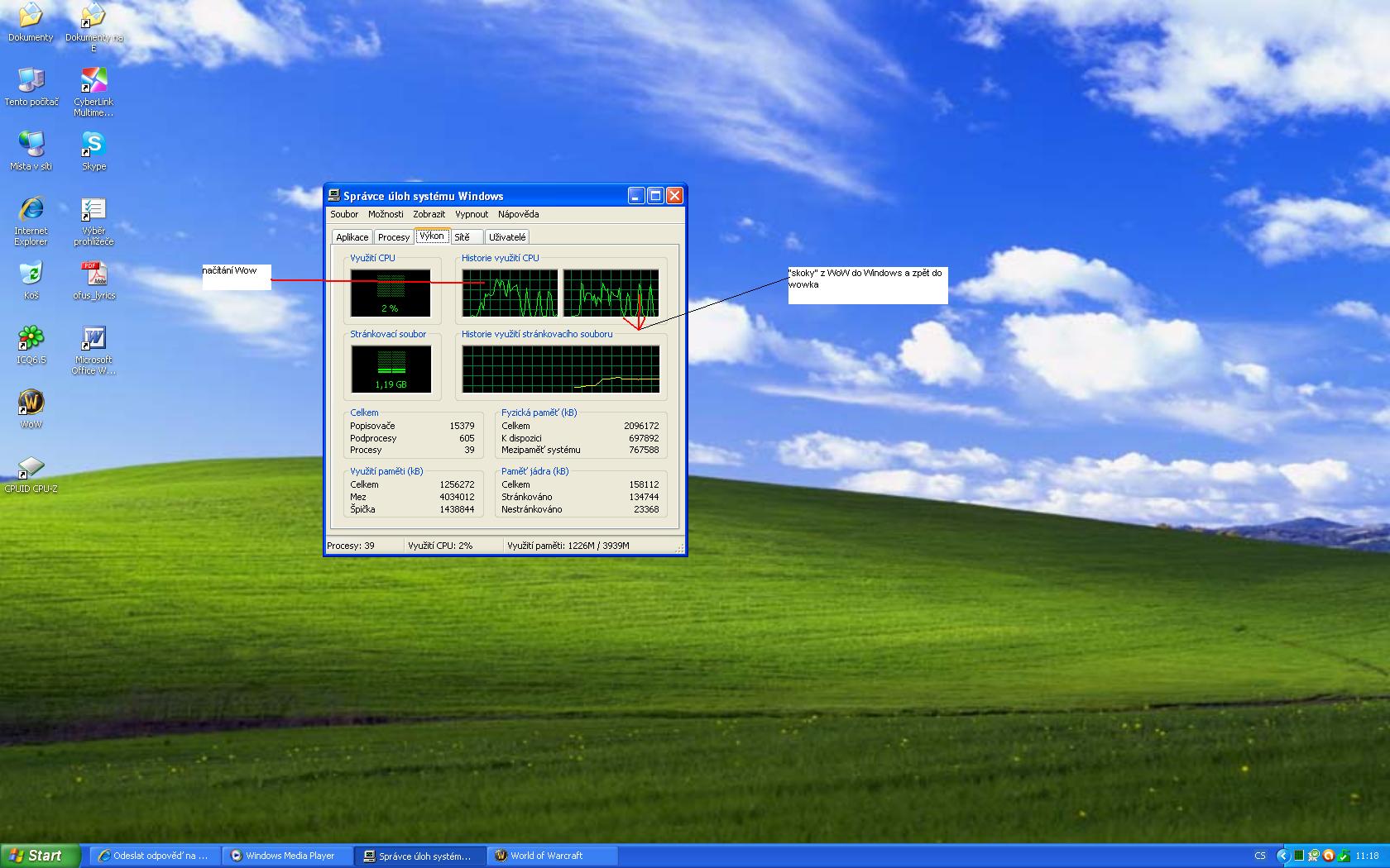 vim je to hustý, ale ikdyž se mi wow sekalo a bylo skoro nehratelný tak při těchto cca 7fps byl zvuk jak z wow tak z mp3 čistý, nezkreslený prostě tak jak má být. Už jsem kvůli tomu zformátoval celej disk, přeinstaloval windows, tak si myslim, že problém tady nebue, kodeky a ovladače sem si stáhnul nejnovější od výrobce a nic, vyčistil sem celý PC nandal novou chladící pastu a všechno v pohodě až na ty zvuky pořád. Může to být hardwarem?Mám intel core 2 duo 2,66Ghz, 2GBRAM(2 x 1G do dualu), GeForce8600 GT(256MB) a základovku od ASUS P5K . Na dnešní dobu to žádný dělo neni to vim, ale tak proč to dělá až ted? Zdůraznuju že nic půštěnýho krom wow ve windows nemám a na tý sestavě kterou mám musí běhat wow jak hodinky. Když si zapnu aplikaci guitar pro(přehrávání tabulatury) nebo windows media plyer a pustim si třeba word tak pak při přecvaknutí z guitar pra do wordu se zvuk taky trochu zaškobrtne. Neni to tak markantní jako když se třeba načítají hráčské postavy ve wow a to i v průběhu hraní či sledování okolní krajiny. Prostě kdykoli je větší zatížení na sestavu, ale princip zkrelsení je znát na chvilku. Na mě to dělá dojem jako kdyby propustnost dat na základový desce byla najednou nizká, ale zase to by se zpomalil PC celkově a nejen zvuk, tak nevim. Už jsem tento problém řešil delší dobu a bylo mi řečeno, že si mám koupit novou zvukovou kartu. Otázka zní jestli koupě nový zvukový karty vyřeší problém a jestli když si třeba koupim novou základovou desku, tak jestli nebudu mít problémy s windows, když sem si koupil originální a mám je aktivovaný k téhle sestavě. Abych nebyl nařčen z toho, že jsem instalaci windows ukradl. Zvuková karta na MB je integrovaná v současné době. Přidávám sem přílohu průběhu zatížení CPU a RAM. Nevim jestli to jde nějak líp a inteligentnějc jak to měřit, mě napadlo tohle. Při načítání se zatížení vytáhne až na 85% tento průběj je zaznamenám až po cca 3.pokusu načíst wow. Čili v RAM zůstal wow ještě uložený a proto je zatížení relativně malé, ale i tak se mi to dost nezdá. Když jsem to zkoušel poprvé tak při prvním načítání wow ta první křivka byla skoro konstantní funkce ve výši 80-85% a po docela dlouhou dobu. Nic méně praskání, které mě tak děsně irituje se přesně projevuje ve vrcholech průběhuzatížení CPU jakmile zatížení klesne, tak zvuk funguje naprosto v pořádku, viz skoky do windows a zpět. Kdyby se to dělo jen při načítání wow tak to ještě nějak zkousnu, ale tyto vrcholy občas nastávají i během hraní či běhání po lese a i při jiných činostech na PC slyšim, že to v těch bedýbnkách mírně zapraská(viz.guitar pro a word
