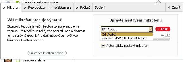 Je tam jen na výběr jedna možnost. Dodal jsem i nastavení ve Windows a ovladačích, prostě teď to třeba jede, ale počítám, že za nějakou dobu to zas z ničeho nic přestane a pak už ani na mluvení nereaguje to vedle toho mikrofonu z windows a když někdo začne mluvit na skypu, tak se to hýbe.