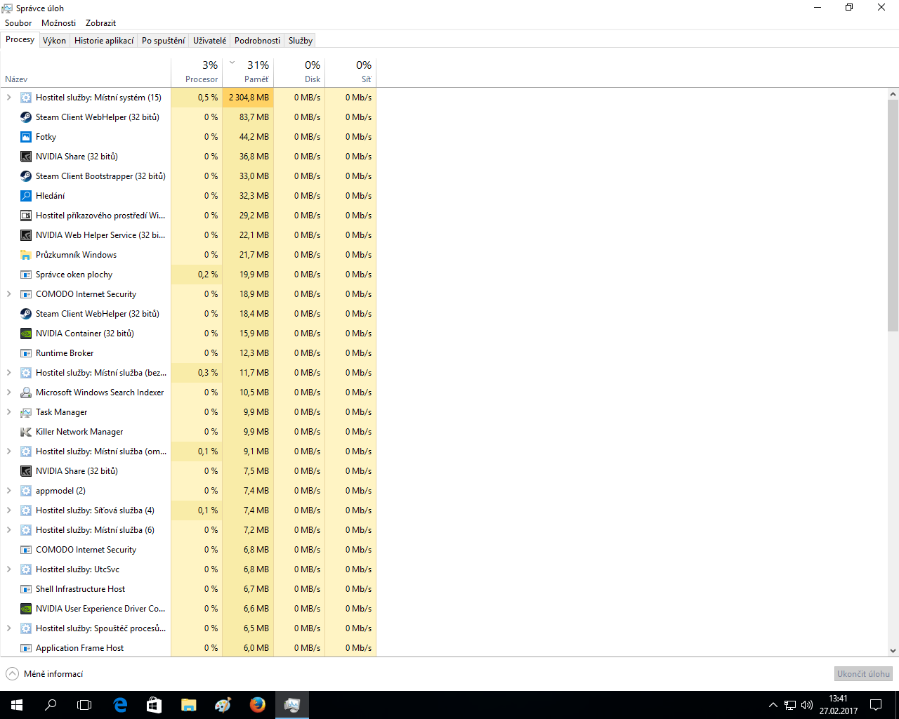 Mam zaplé pc 17 hodin a Hostitel služby místní systém zabírá 2,3gb ram a jde to pomalu ale jistě nahoru,takže za pár dní to bude zabírat třeba 40-50% ram.Po restartu nezabírá prakticky žádnou ram.Jsem rád že to asi nebude nějaký vir nebo tak něco,ale pořád nevím co to způsobuje nebo jestli to je běžný.Asi tak jednou za dva týdny mi to hází blue screen memory management,třeba to bude nějak souviset s tou ram.