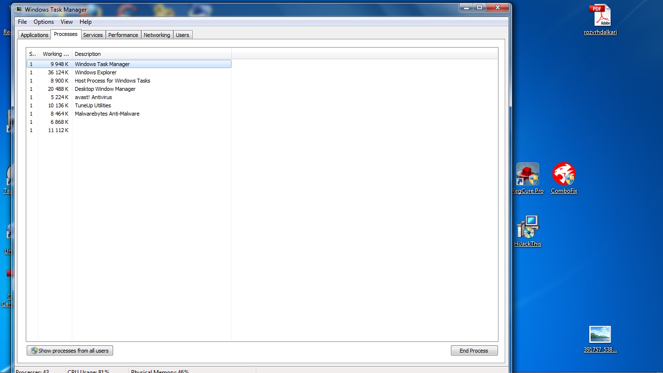 Restartoval jsem a spustil scan Hijack s vytvorenim logu znova, nejake polozky zustaly neodstraneny a log mi nechtel vytvorit, vyfotil jsem a obrazky prikladam. Prosim o radu co s tim dal. Dal jsem sputil Task Manager a dole jsou dva procesy bez popisu, prikladam foto. Je to v poradku?