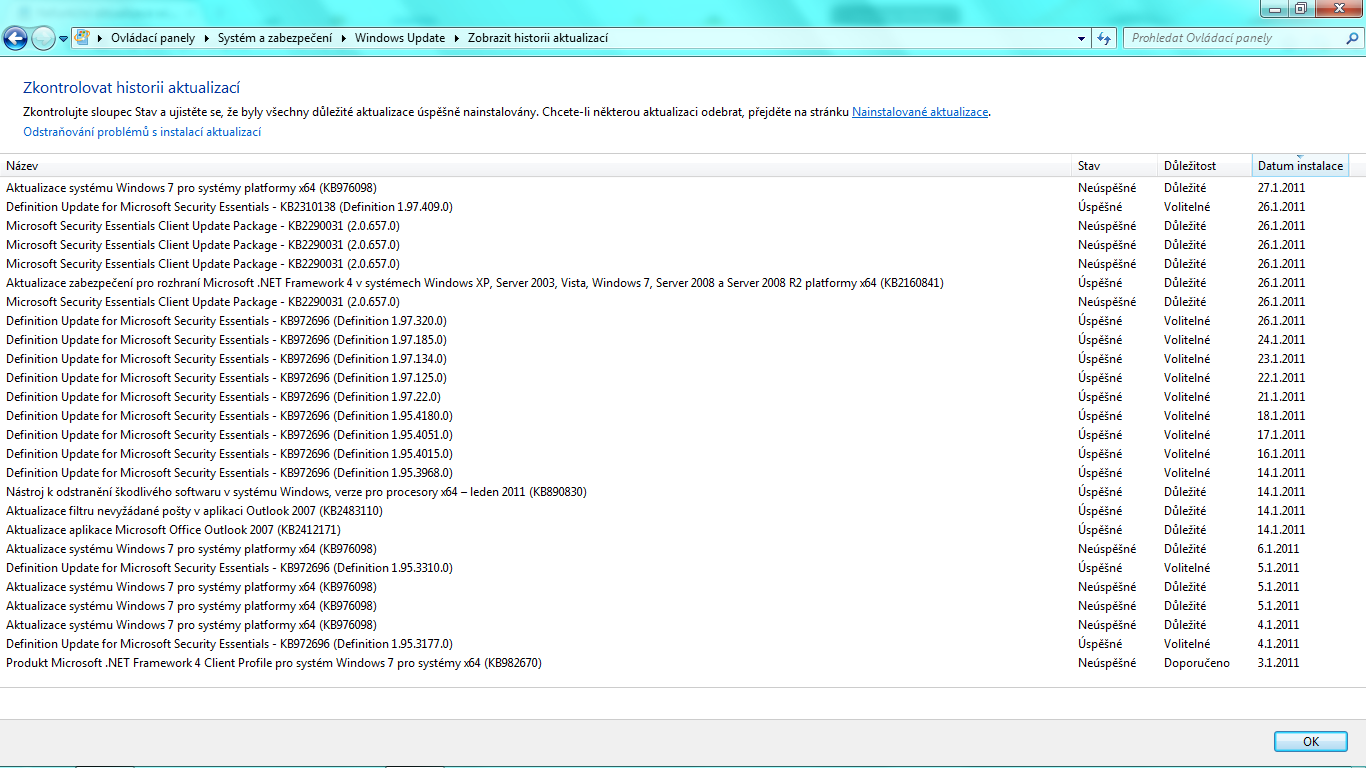 windows update--zobrazit historii aktualizací--------píše Ti to tam někde neúspěšné??