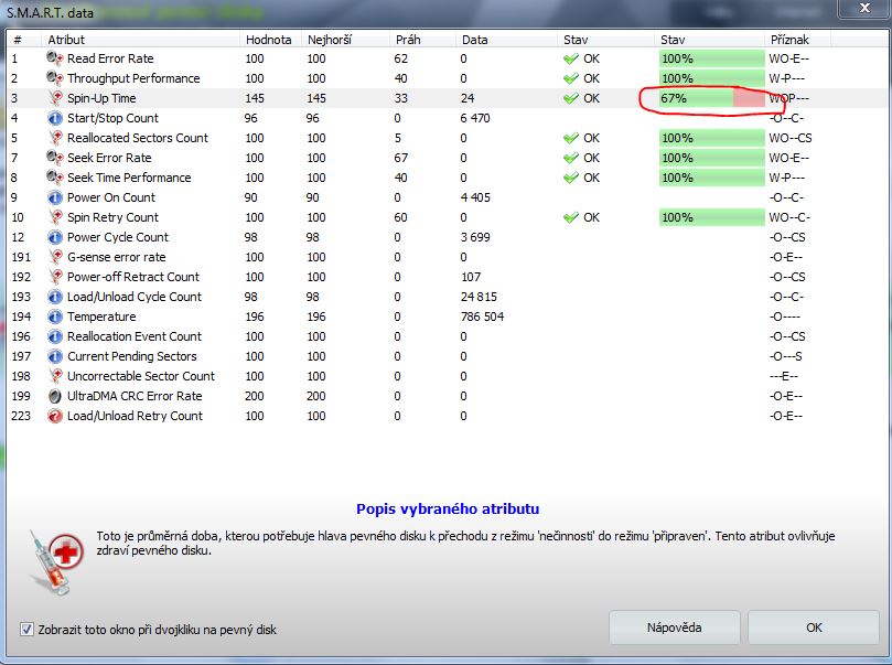 Čas potřebný k roztočení ploten. S časem se zhoršuje, avšak poměrně pomalu. Náhlá změna značí poškození motorku otáčejícího plotny.