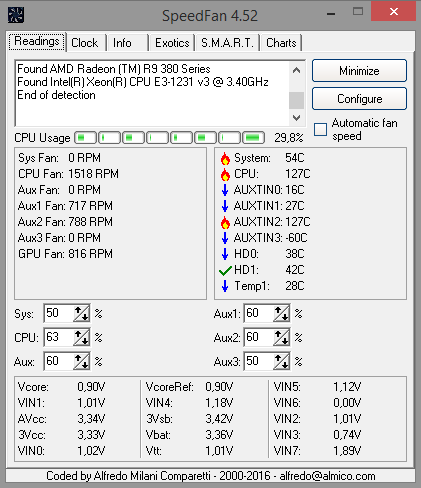 HWmonitor používám dlouhou dobu, kontroloval jsem teploty dost krát v různých situacích, nikdy tam procesor takových teplot nedosahoval. Když jsem u HWInfa viděl u procesoru 127 °C, tak jsem si myslel že to je nějaká chyba. U HWmonitoru dosahoval vždy CPU, co si tak vybavuji, okolo 50 °C. Viz starší screen, co jsem našel v telefonu.