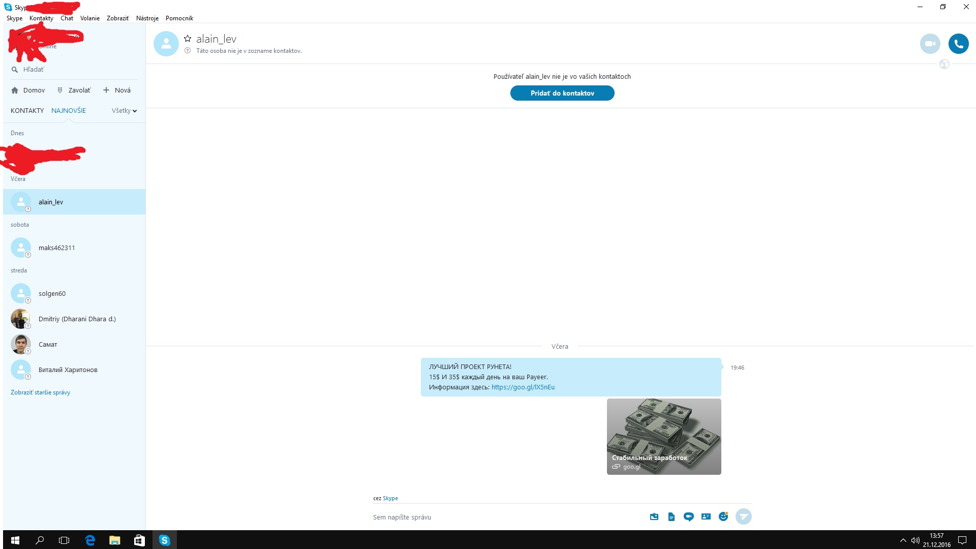 Zdravím poslednú dobu zhruba mesiac si ma na skype pridávajú neznáme kontakty. Je to tak zhruba raz za 4-5 dní kedy v priebehu pár minút si ma pridá do kontaktov 10-20 ľudí. Majú rôzne mená aj profilové obrázky. Každý jeden mi vždy odošle ten istý text + link. Všetko je to v ruštine takže tomu ani nerozumiem. Nikdy som na ten link neklikol a vždy si tie kontakty rovno blokujem a mažem s kontaktov tipujem že je to pokus o nejaký vírus alebo také niečo. Neviete mi poradiť čo s tým mám robiť? Je to dosť otravné a rád by som sa toho nejakým spôsobom zbavil. Za každú radu budem vďačný.