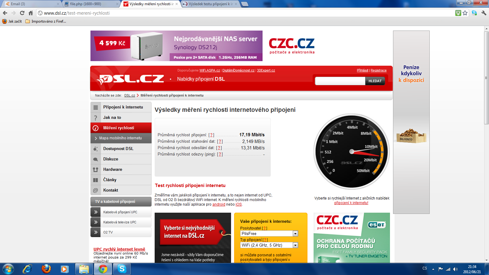Čau, čau - tento měřák, co jsi mi sem dal, tak měří totálně špatně... Když pustím stahování z http://www.slunecnice.cz , tak se mi daný soubor stahuje 11,5mb/s. A když nahrávám na http://www.Uloz.to , tak to jde 9990kb/s. Jedniné měřáky, které jsou stavěné na tak vysokou rychlost je: http://www.speedtest.net a i bych řekl, že http://www.rychlost.cz .