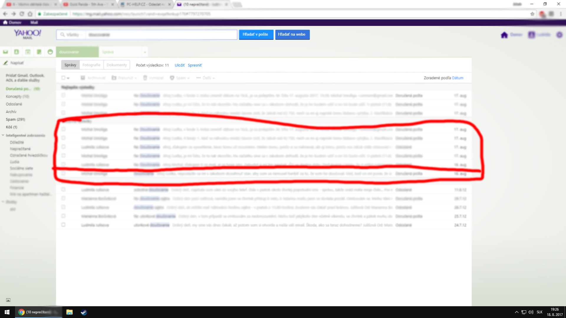 Dobrý deň, nedávno som si s jedným nemenovaným preposlal pár mailov a jednoducho povedané si jeho prvú správu nemôžem zo záhadného dôvodu prečítať - celé okno je totiž len biele. Skúšal som iný pc, to nepomohlo. Skúšal som taktiež vymazať z histórie všetko čo sa týkalo Yahoo stránky ako takej, taktiež nepomohlo. Má niekto nejaký nápad ako docieliť aby sa mi ten mail podarilo zobraziť znovu? Dá sa vôbec už nim odoslaný a mnou prečítaný email odstrániť tak aby som si ho už znovu prečítať nemohol? Nejakým rozšírením prehliadača? Prikladám snímku obrazovky ako vyzerá niekoľko emailov - ten oddelený je prvá správa od dotyčného, ktorá sa nedá zobraziť a tie ostatné sa zobrazujú v poriadku.