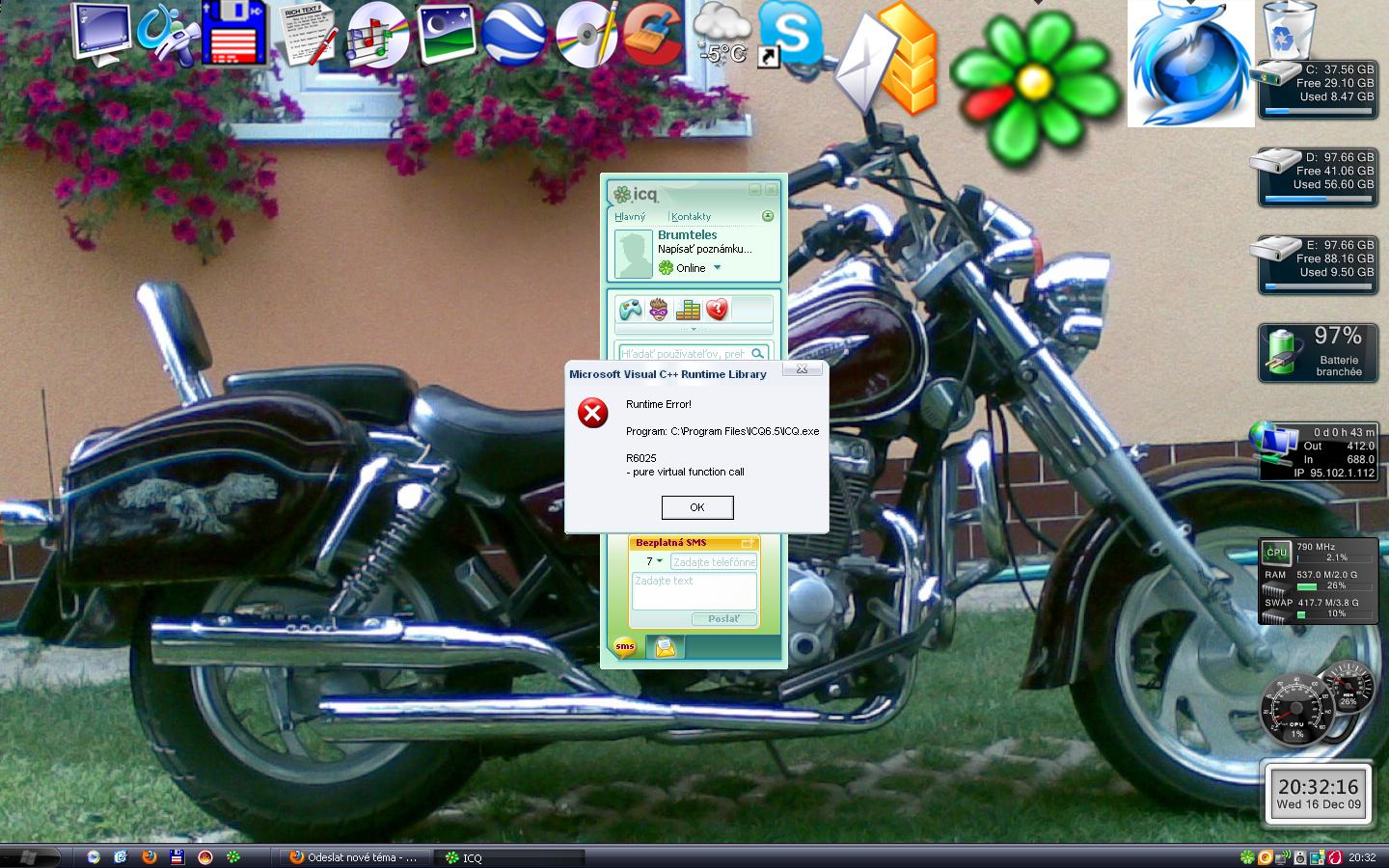Spustil som memtest a všetko je OK. Nainstaloval som Javu, Net Framework, Microsoft Visual C++, Windows instaler a stále je to to isté. Icq sa spustí a asi po 10-15 sekundách nabehne tá hláška z prvého screenu. Po jej odkliknutí naskočí tá druhá a po nej sa icq ukončí. Už neviem čo stým.