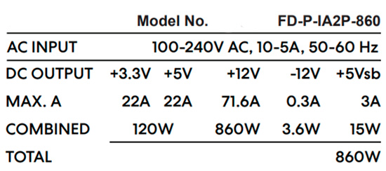 Jedná se o spolehlivý ATX zdroj s výkonem 860 W a modulárním designem kabeláže. Má tichý 140 mm ventilátor. Disponuje 80Plus Platinum certifikací.