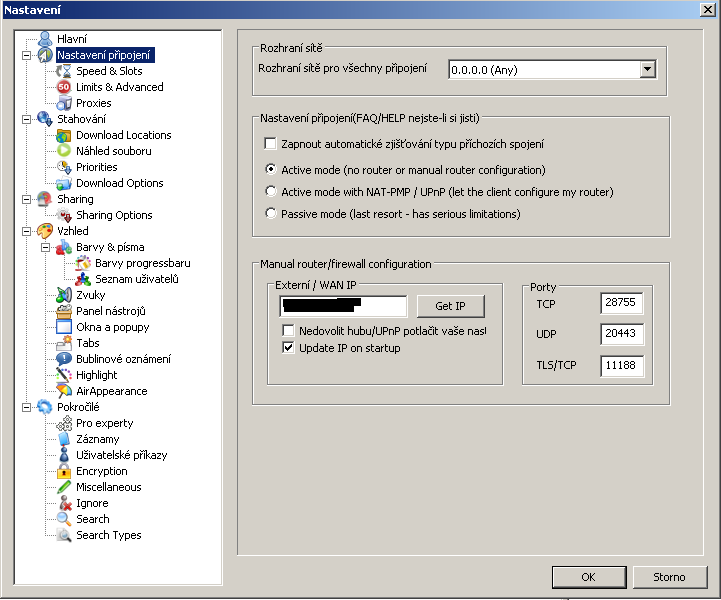 Nastavení připojení: Active mode, no router or manual router configuration -> (tady je ještě možnost zvolit "active mode with nat-pmp/upnp (let the client confihure my router))."