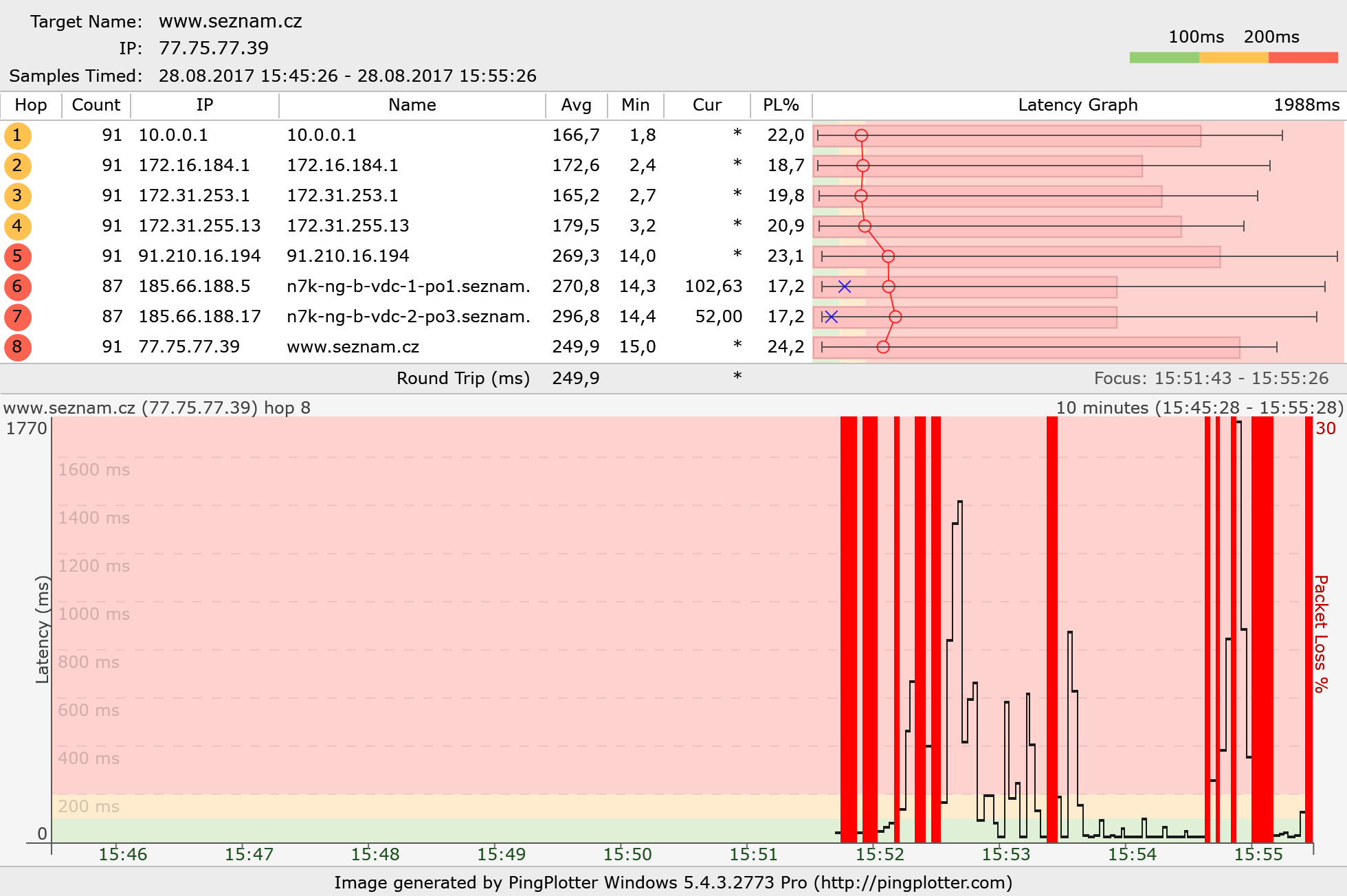 V mém podpisu najdeš návody na diagnostiku sítě. Pročti. Bude mě zajímat screen pingplotter, třeba na seznam.