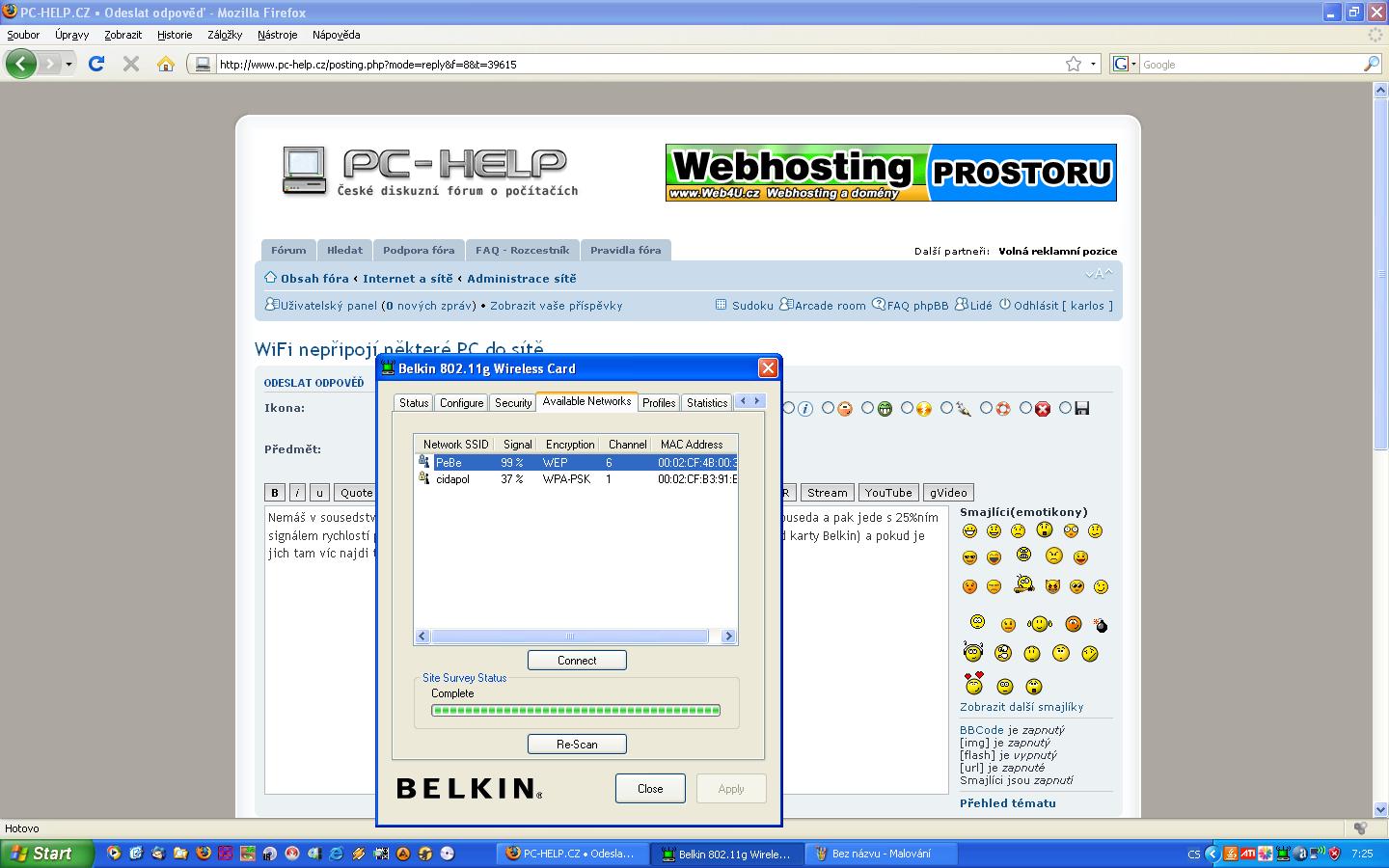 Nemáš v sousedství jinou, nezabezpečenou síť? Mně se takhle občas připojí na nějakého souseda a pak jede s 25%ním signálem rychlostí pod 10Mb/s. Vyhledej si dostupné sítě (v mém případě WirelessUtility od karty Belkin) a pokud je jich tam víc najdi tu svou a na tu se připoj. Na obrázku je vidět moje a kamarádova síť, občas se tam objeví dvě, zcela nezabezpečené :shock: a na ně se pak wifina přihlásí.