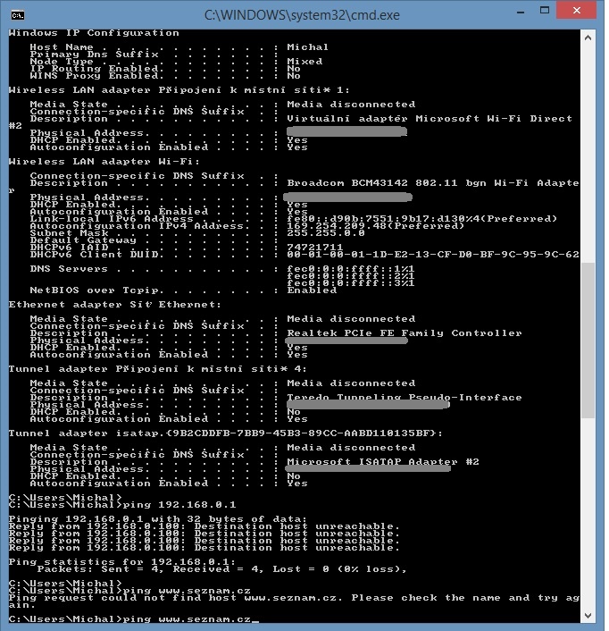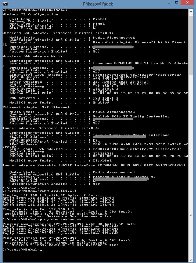Tak jsem provedl diagnostiku nejprve s vypnutým TP-LINKem, vše v pořádku. Výpis z cmd vypadá takto: