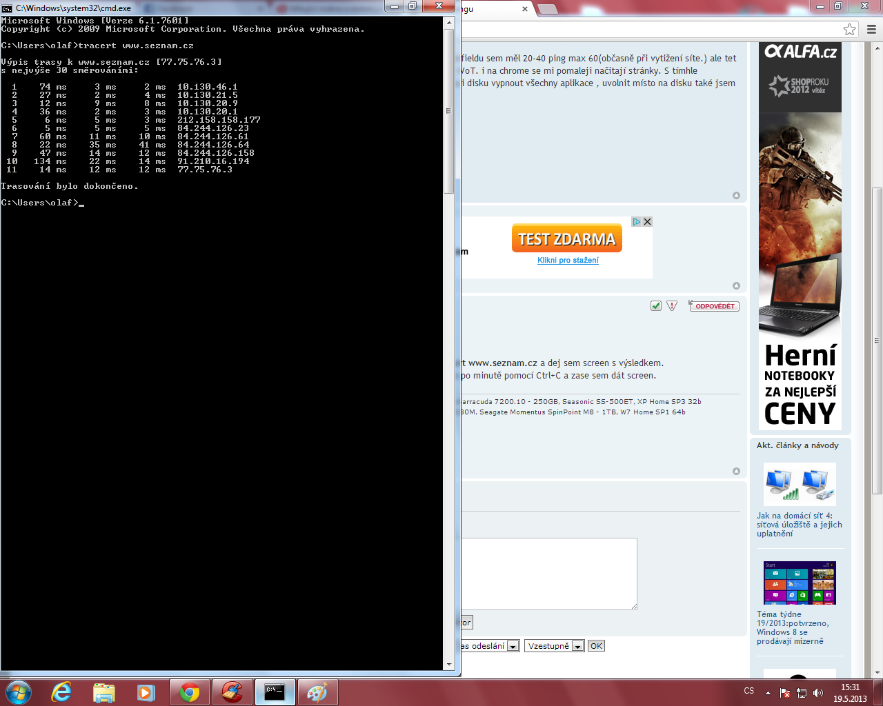 Dobrý den, v posledních týdnech sem zpozoroval zvýšení pingu .Např v battlefieldu sem měl 20-40 ping max 60(občasně při vytižení síte.) ale tet mam tak 80-150 a co tři minuty až 1500 a potom mne to vyhodí.To samé u WoT. i na chrome se mi pomaleji načitají stránky. S tímhle problémem nevím co mám dělat. zkoušel jsem čistení registru defragmentaci disku vypnout všechny aplikace , uvolnit místo na disku také jsem zkoušel projet pc antivirem. moc nepomohlo.
