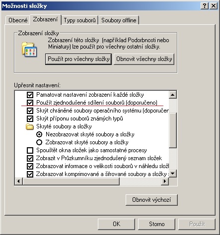 Zjednodušené sdílení je zapnuto, počítače jsou ve stejné pracovní skupině.