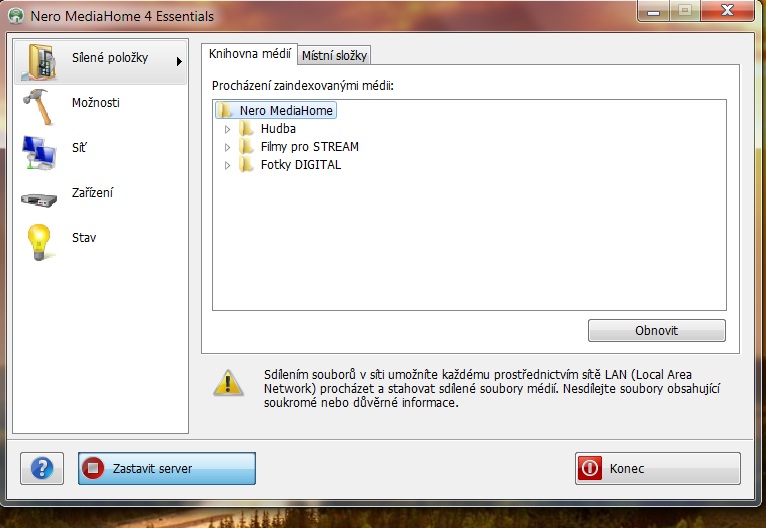 Proč se neřídíš tím co jsem napsal ? Mám Smart LG a po nainstalování Nero Media Home to funguje jak má. Prostě ten program v PC nainstaluješ,v levém rohu programu zvolíš Spustit server a na TV se ti zobrazí ikona Nero Media Home.Tu rozklikneš a už procházíš soubory co chceš přehrát.Zatím se mi ještě nestalo,že by něco takto nefungovalo.Mám to ale táhlé přímo síťovým kabelem.