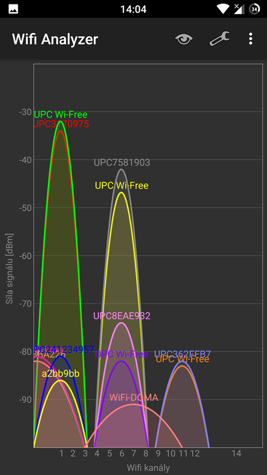 Bohužel teď nemám notebook, abych přiložil screenshot z InSSIDeru. Na pevném PC asi nejde použít, ukazuje mi to že neběží služba WLAN AutoConfig Service (Nemám wifi). Ale žádnou takovou v PC nemám, mám tu jenom Wired AutoConfig Service a ta je spuštěná. takže jedině screenshot z Wifi Analyzeru na telefonu.
