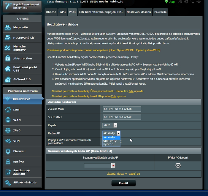 Dále v záložce " bezdrátové " je režil AP, ale to WDS je asi něco jako repeater, což nechci.
