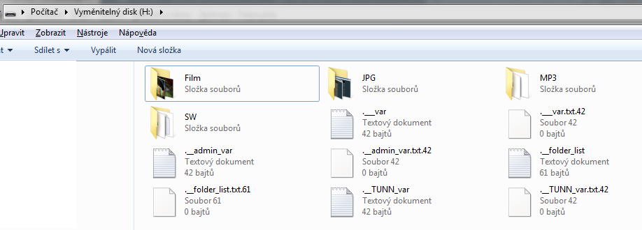 1. Nahraješ si multimediální soubory na USB disk. Já volil složky MP3, Film, JPG. A vypadá to takto: