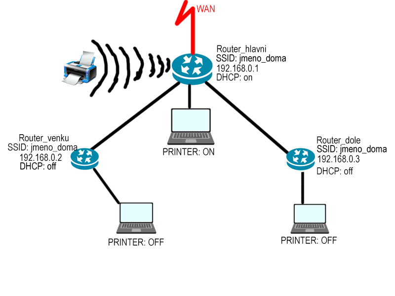 SSID vysílají všechny Wi-Fi stejné (jmeno_doma). Dříve jsme to měli tak, že každá wifi měla vlastní název a pokud se potřebovalo tisknout, tak se člověk musel připojit na wifi, ke které byla připojena tiskárna, v tomto případě na router_hlavni.