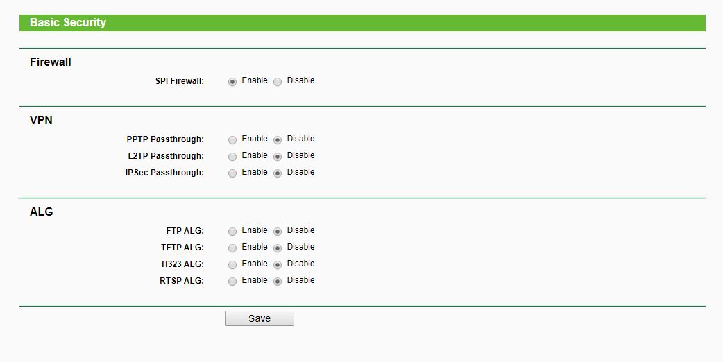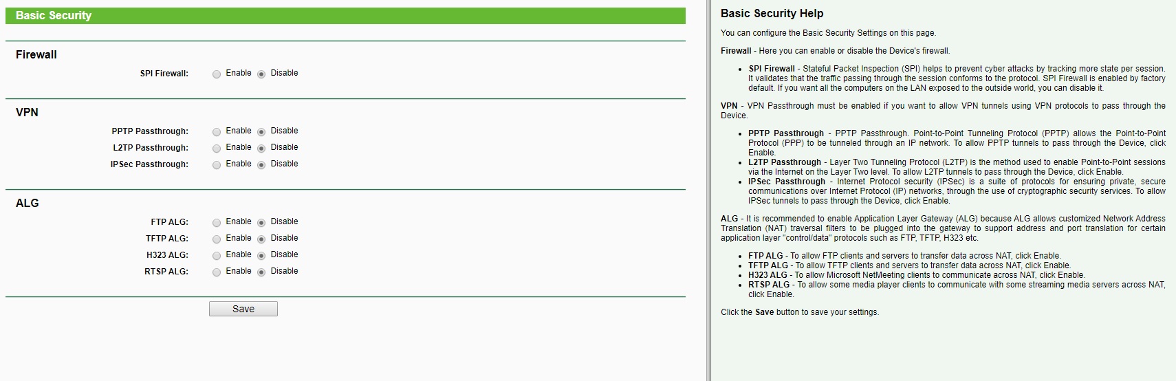Dále bylo potřeba vypnout v basic security VPN a ALG kolonky. (Zatím to nechávám běžet jenom na firewallu, protože když zapnu vše, okamžitě to zase přestane fungovat a nepingnu si z AP). Tudíž nyní to security vypadá takto: Zkusím s tímto experimentovat tak, abych našel tu kolonku, která to celé narušuje. Popřípadě, mohli byste mi prosím ještě říct, která z nich to může dělat?
