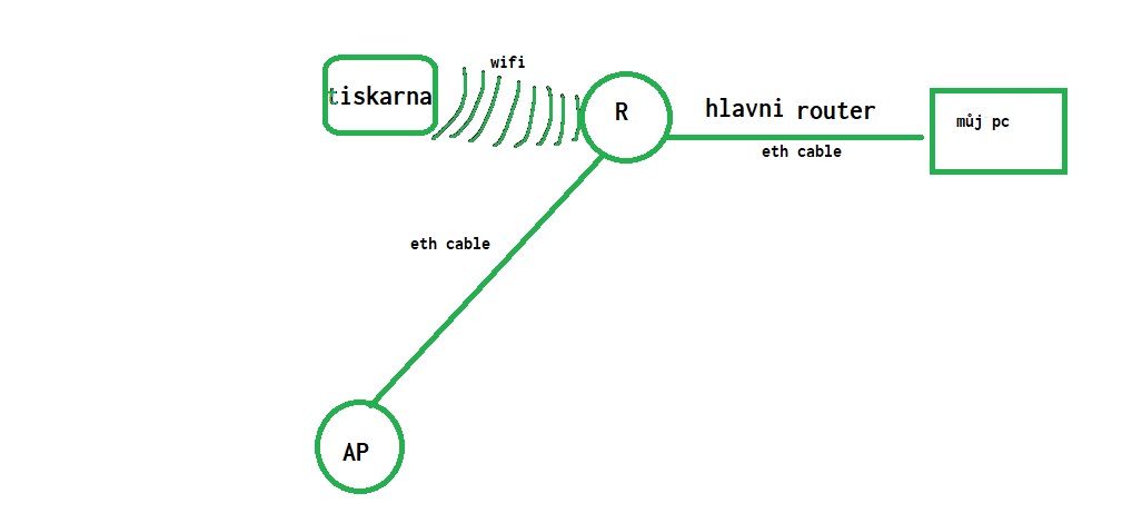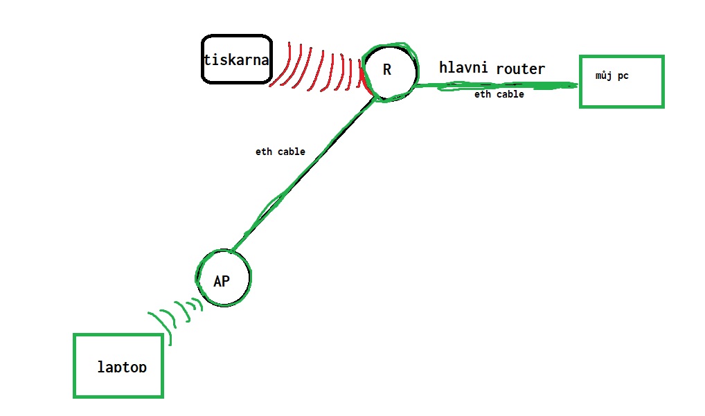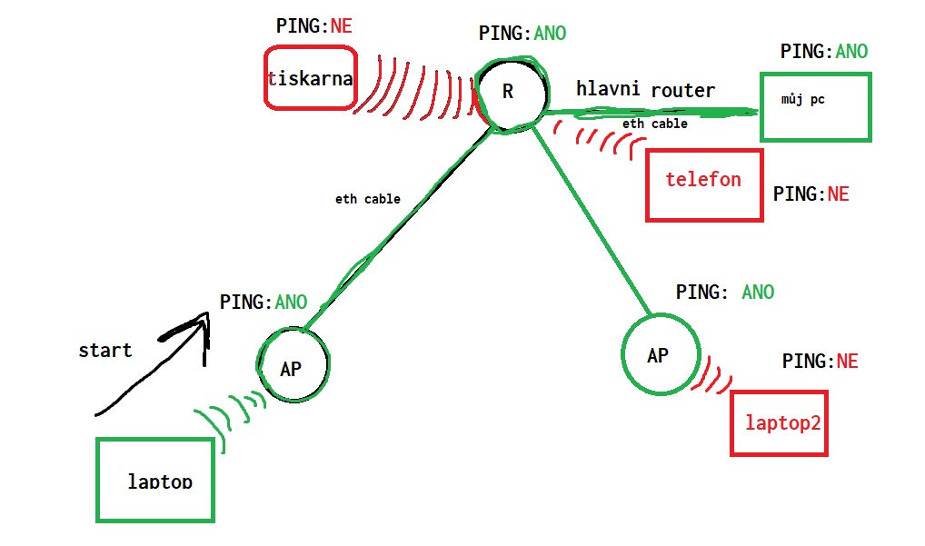 EDIT: Takhle nyní vypadá to schéma, pokud pinguju z AP (zelená trasa = dokážu si pingnout na tiskárnu z AP a zároveň na svůj PC) Takhle vypadá schéma, když pinguju ze zařízení připojeném k AP pomocí WiFi (dokážu si pingnout na svůj PC na hlavním routeru, ale ne na tiskárnu). Takhle vypadá schéma, pokud pinguju ze zařízení na zařízení: Vypadá to, jako by zařízení, která jsou na WiFi nemohla vidět žádná zařízení, která jsou také na wifi, ale můžou vidět zařízení, které je připojeno kabelem do routeru. Což by vysvětlovalo, proč já z hlavního PC mohu pingnout všechna zařízení, ať jsou na jakémkoliv AP.