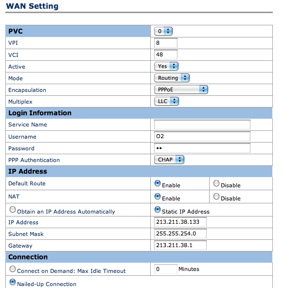 Pevná IP adresu od poskytovatele: 213.211.38.133, maska sítě 255.255.254.0, brána 213.211.38.1.