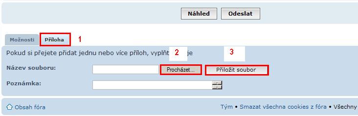 Postup kam kliknout při psaní odpovědi pokud chcete vložit do odpovědi fóra PC-Help nějaký soubor přílohy ukazuje následující obrázek: