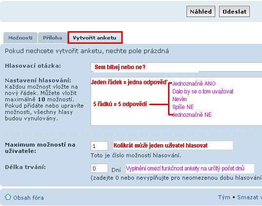 Možnost založení ankety pro každé podfórum při zakládání podfóra nastavuje administrátor. Může se vám tedy stát že někde anketa nepůjde založit. (Pod editačním oknem odpovědi bude chybět záložka "Vytvořit anketu").