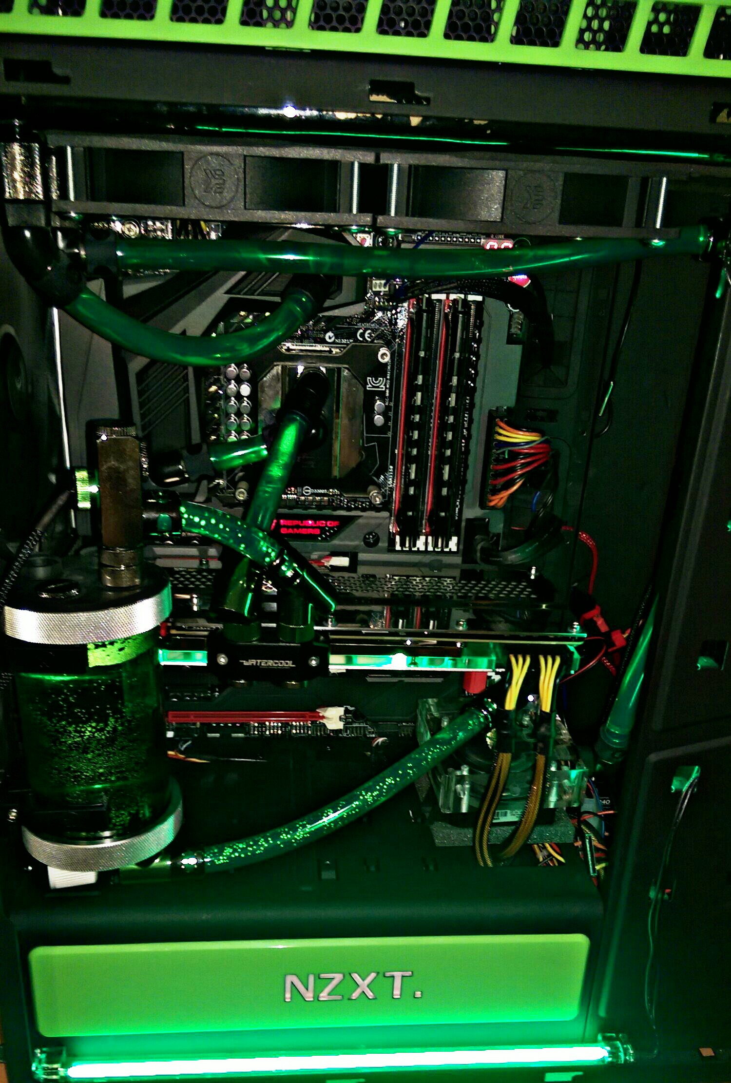 Mám na ni blok a backplate. Dokoupil jsem dopředu 360mm tlustej radiátor EK XE360. Všude v okruhu i blocích je ještě strašně moc bublin, takže chlazení nefunguje jak má.