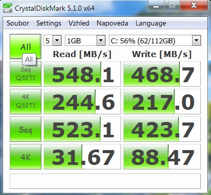 Je fakt, že ve srovnání s http://www.pc-help.cz/viewtopic.php?p=1353313#p1331639 nic moc... Rychlosti se lišit mohou, protože CDM ukazuje max dosaženou, a ta se může lišit dle toho, jak zrovna OS šahá na disk...