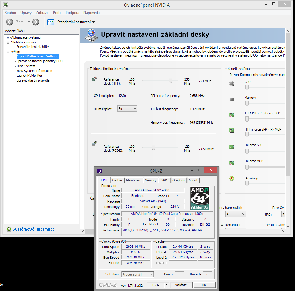 Ahoj, přetaktoval jsem si pomocí ovládacího panelu Nvidia procesor AMD Athlon 64 X2 4800+ 2.51 GHz na 2.80 GHz. Moje základní deska MSI MS 7309 v1.0 nepodporuje taktovnání procesorů (v BIOSu nejde nic nastavit), ale někde na zahraničním foru jsem se dočetl, že právě pomocí např. ovládacího panelu Nvidia můžu měnit parametry systému. Tak jsem to zkusil a opravdu jsem mohl měnit parametry. Abych se přesvědčil tak jsem si nainstaloval CPUID CPU-Z, který mi u frekvence taktéž zobrazoval 2.80 GHz. Myslel jsem si, že jsem úspěšně popohnal moje staré CPU, ale po resetu, když jsem se podíval do BIOSu, tak mi zobrazoval tovární frekvenci CPU (2.51 GHz). Po naběhnutí Windows mi CPUID CPU-Z taktéž zobrazoval původní hodnoty před taktováním.