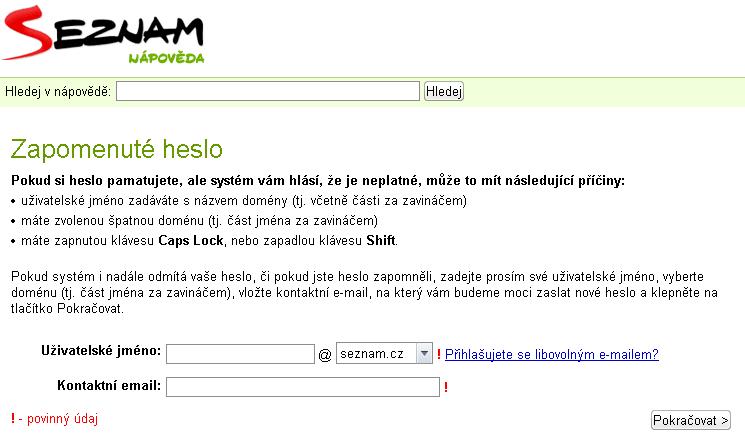 Do pole -Kontaktní email- zadej email, na kterej chceš, aby ti přišlo heslo. Zmáčkni tlačítko "Pokračovat".
