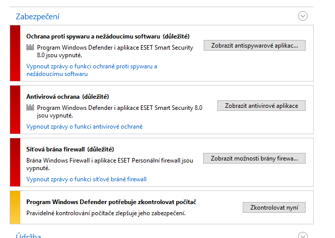 Chci se zeptat FireWall mi spravuje Eset smart security ale když dám Zabezpečení a udržba že to je vyplé mám to nechat být nebo to funguje jak má ? .