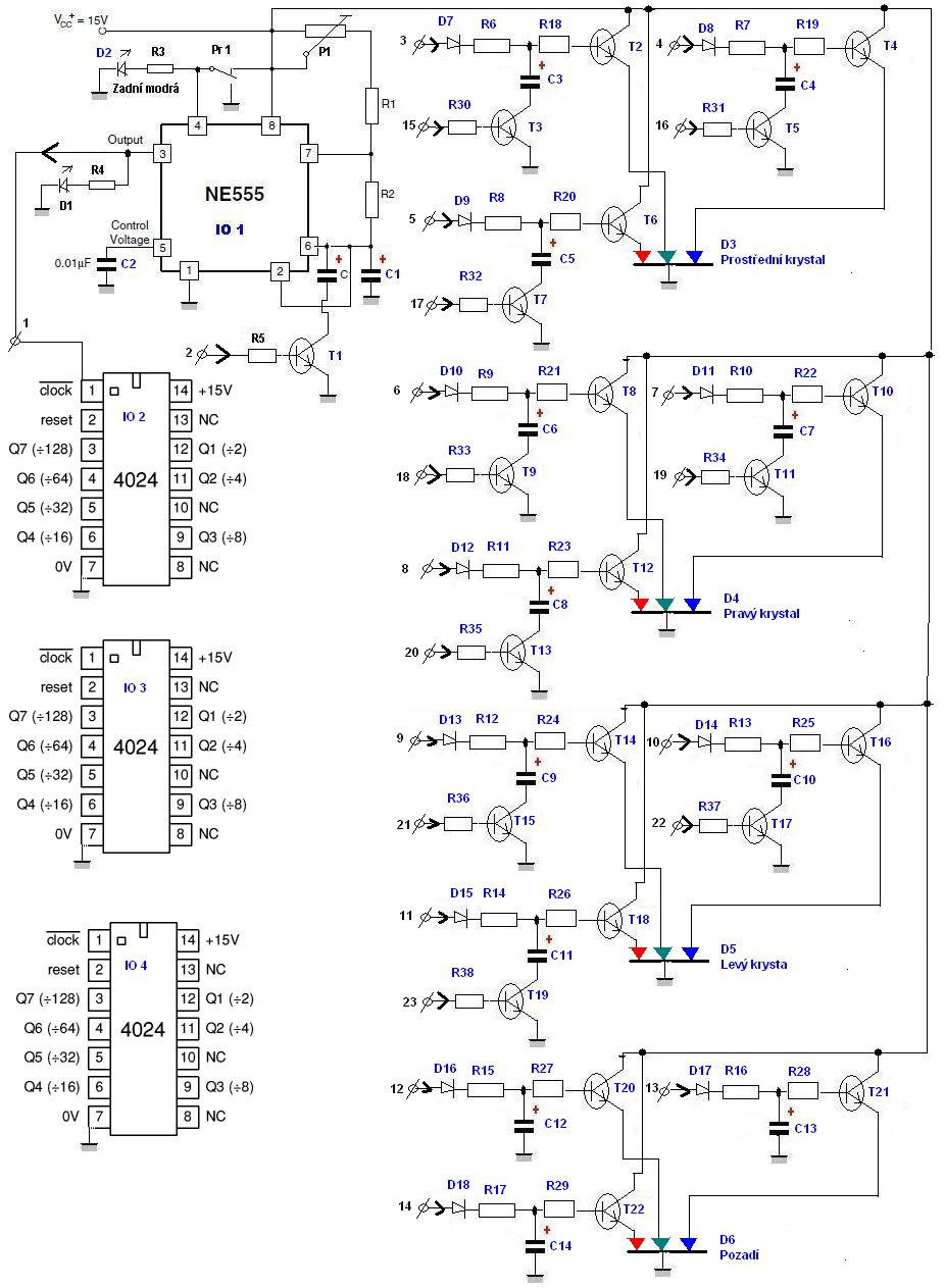 To Teedok Než dorazím definitivní schema zapojení skýtá možnost uděllat si vlastní pevný program jak se budou rozsvědcet jednotlivé LED potažmo jejich barevné kanály. pokud použijeme 3Ks MHB4024 a zapojíme je jako následný dělič z předchozího IO dostaneš 21 výstupů jejichž stavy se prokombinují stylem každý s každým. Možná že by bylo dobré ukázat ti možnosti naprogramování a schéma nechat jako stavební díly s očíslovanými svorkami a uvést tak max 3 píklady funkčních tabulek celého zařízení v závislosti na propojení jednotlivých dílů. Pro mě je to pracnější ale z hlediska praxe pro tebe poučnější ve finále by si mohl zvládat funkční tabulku IO MHB4024 s prstem v nose. Takže chceš definitivní schema nebo schema stavebních dílů a pokusit se odvozovat si samozřejmě dle příkladu funkční tabulky tedy zařízení si naprogramovat?