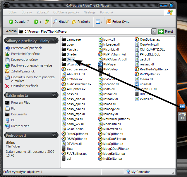 http://www.kmplayer.com/forums/index.php? Pridanie skinu: Stiahnuť na prac. plochu a vystrihnúť do priečinka Skins. Skin sa mení kliknutím pravým tlačítkom myši na horný panel otvoreného prehliadača, rozbalí sa ponuka, ísť na Skiny a vybrať si. Farby skinu sa menia v ponuke Skiny hore, možnosť vybrať si z predvolených, alebo si zvoliť vlastnú.